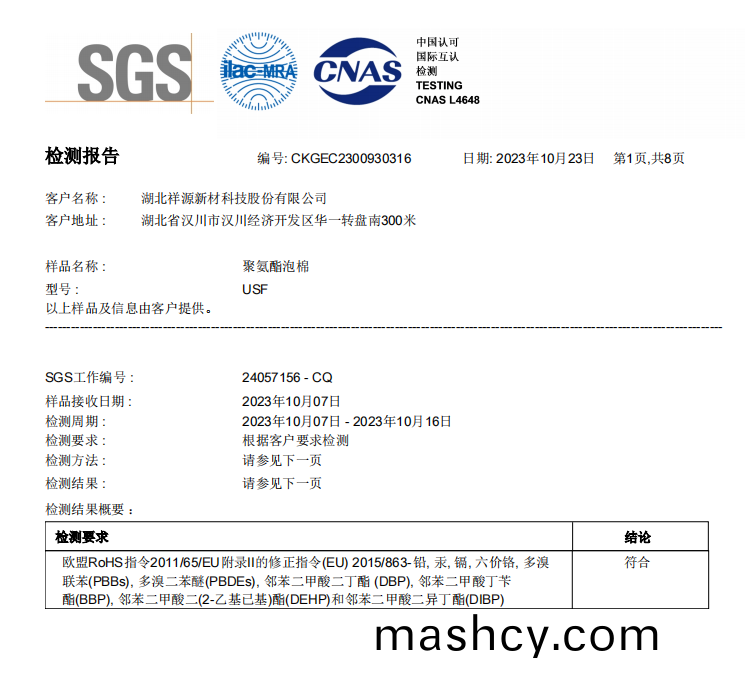 聚氨酯(PU)泡棉 ROHS2.0中(zhong)文测试报告